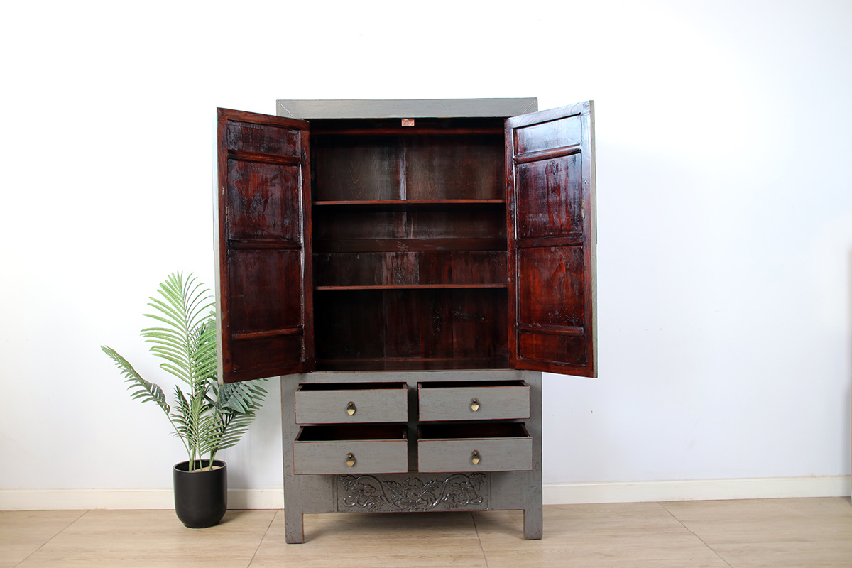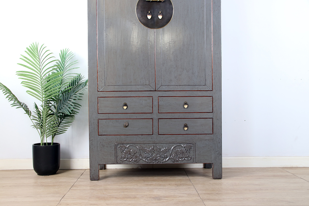 Dieser antike Schrank zeichnet sich durch sein elegantes, klassisches Design aus. Er ist in einem dezenten Grau gehalten und verfügt über eine auffällige, runde Metallbeschlag-Verzierung an den Türen, die den Schrank optisch aufwertet. Im Inneren bietet er großzügigen Stauraum mit mehreren Regalböden, die ideal zur Aufbewahrung von Geschirr, Büchern oder anderen Gegenständen geeignet sind.Im unteren Bereich befinden sich vier Schubladen, die zusätzliche Möglichkeiten zur Organisation bieten. Besonders hervorzuheben ist das kunstvolle Schnitzdetail an der unteren Leiste des Schranks, das einen Hauch von Handwerkskunst und Tradition vermittelt. Die Kombination aus funktionalem Stauraum und dekorativem Stil macht diesen Schrank zu einem Highlight in jedem Raum.