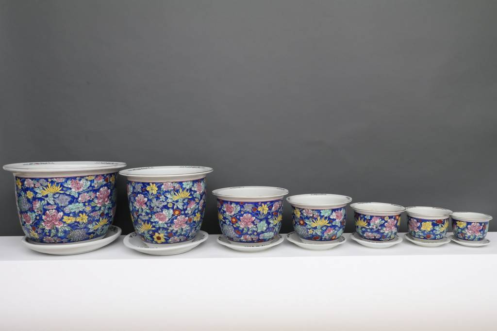 Der Blumentopf wird mit einem dekorativen Porzellan Untersetzter geliefert und ist Teil einer Serie von Porzellan Blumentöpfen / Übertöpfen mit identischem Design mit Blütenmuster.