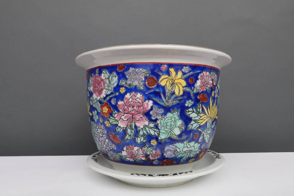 Dieser Porzellan Blumentopf mit einem Durchmesser von 30 Zentimetern besitzt besondere schöne Blau mit bunten Blumenmotiv.