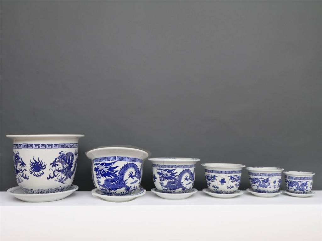 Dieser Porzellan Blumentopf mit einem Durchmesser von 22 Zentimetern besitzt ein klassisches chinesisches blau-weiß Dekor mit Drachen.