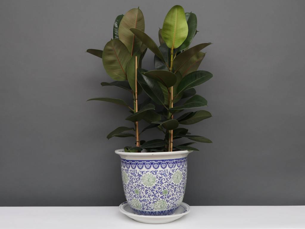 Dieser Porzellan Blumentopf mit einem Durchmesser von 19 Zentimetern besitzt ein klassisches chinesisches blau-weiß Dekor mit einem Pflanzenmotiv in grün.