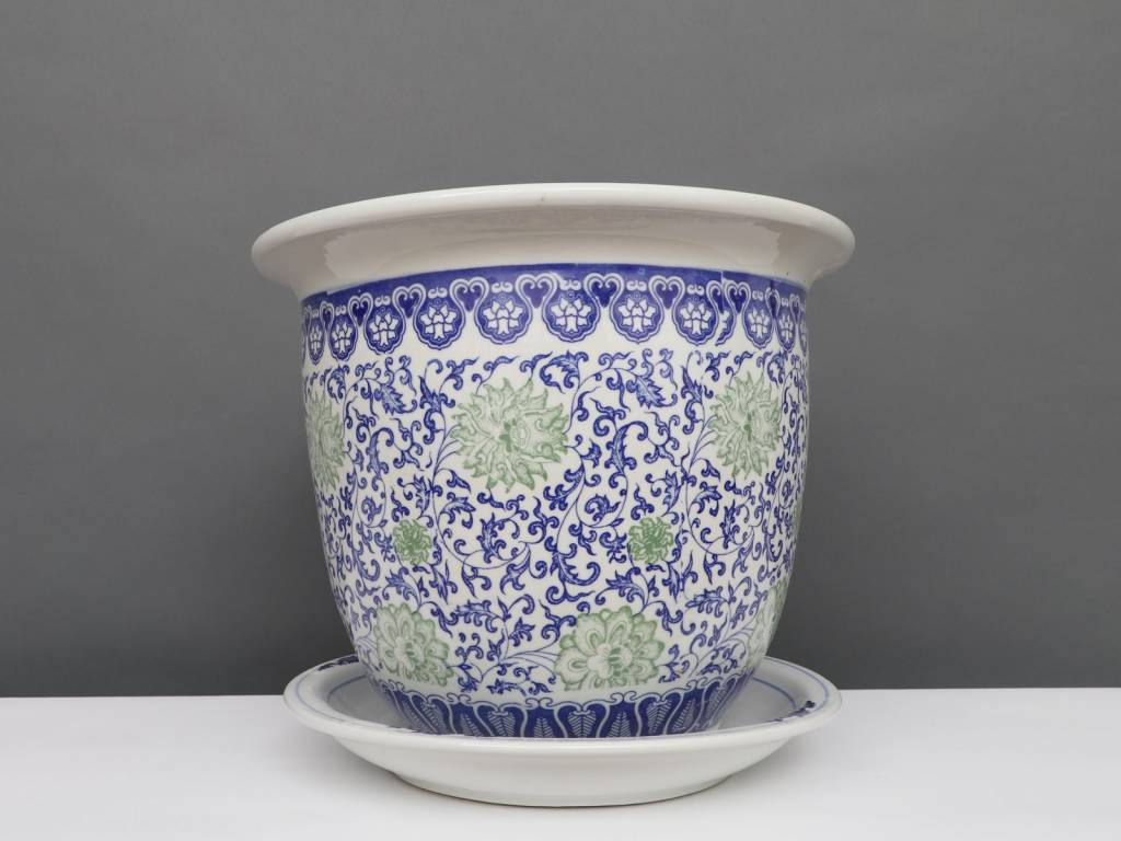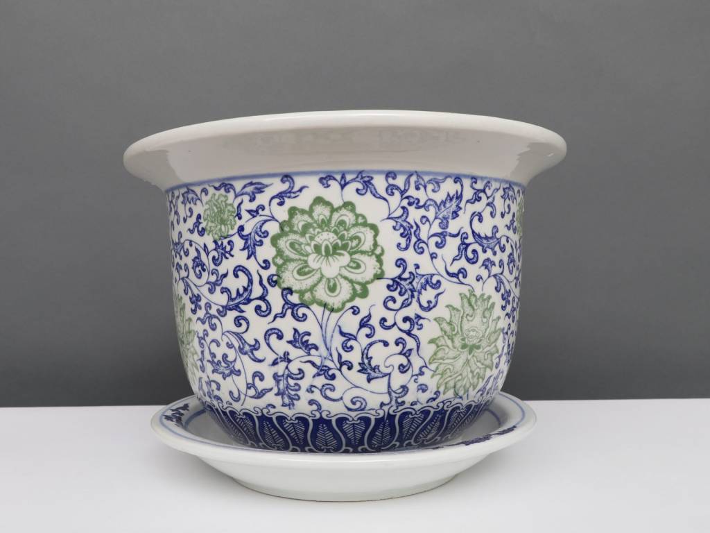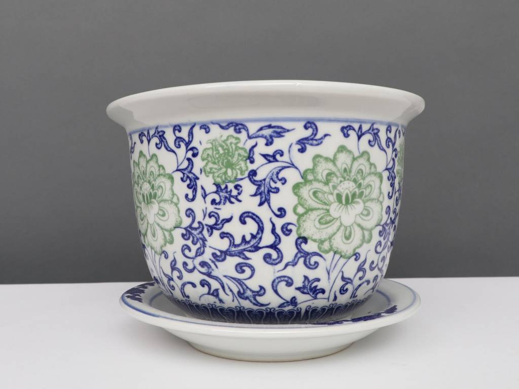 Dieser Porzellan Blumentopf mit einem Durchmesser von 26 Zentimetern besitzt ein klassisches chinesisches blau-weiß Dekor mit einem Pflanzenmotiv in grün.