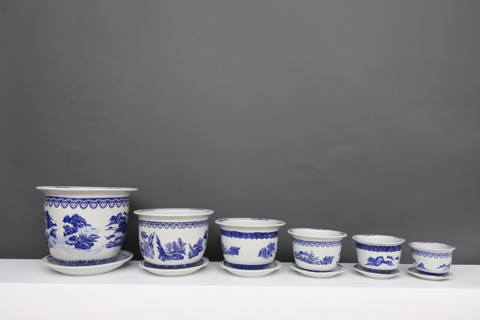 Dieser Porzellan Blumentopf mit einem Durchmesser von 22 Zentimetern (gemessen an der Maximalen Außenkante )besitzt ein klassisches chinesisches blau-weiß Dekor mit Landschaft.