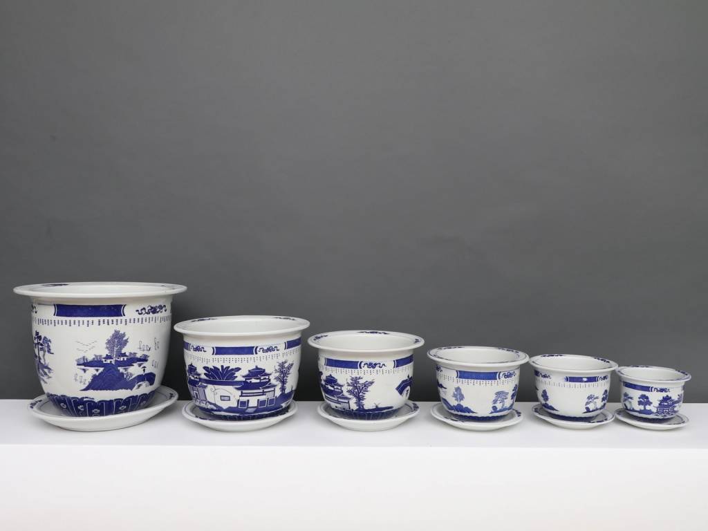 Dieser Porzellan Blumentopf mit einem Durchmesser von 19 Zentimetern besitzt ein klassisches chinesisches blau-weiß Dekor mit Landschaft.