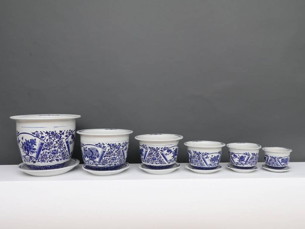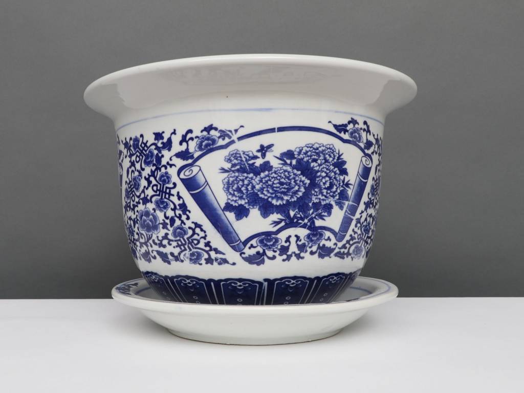 Dieser Porzellan Blumentopf mit einem Durchmesser von 19 Zentimetern besitzt ein klassisches chinesisches blau-weiß Dekor mit Pfingstrose Blumen.
