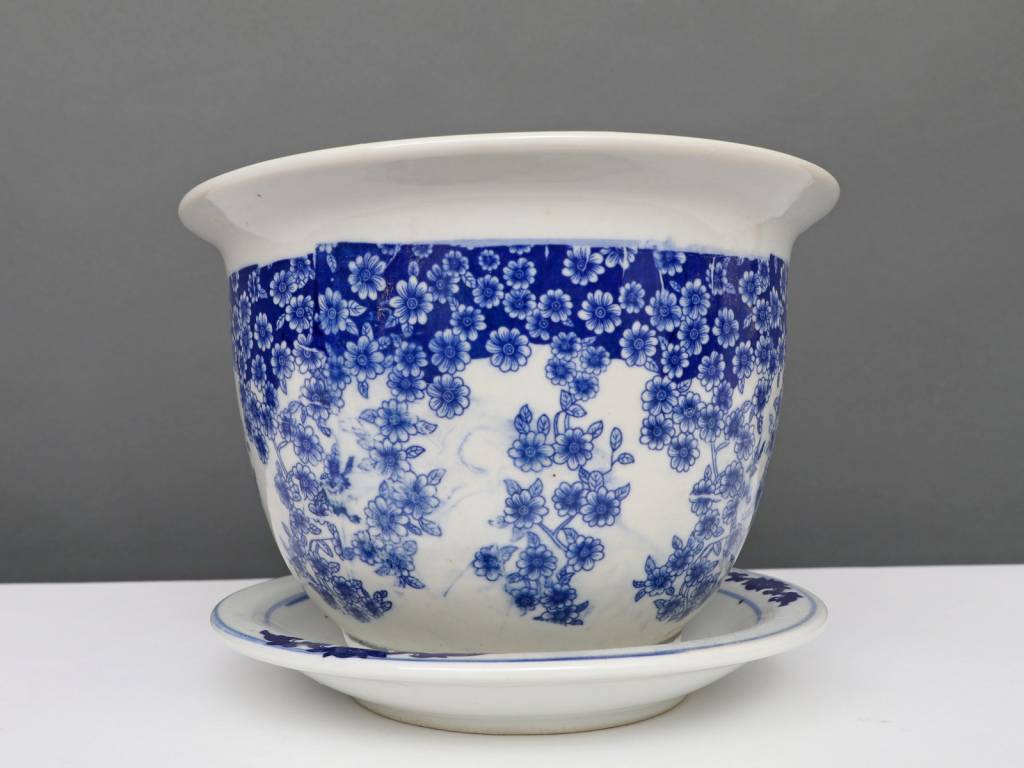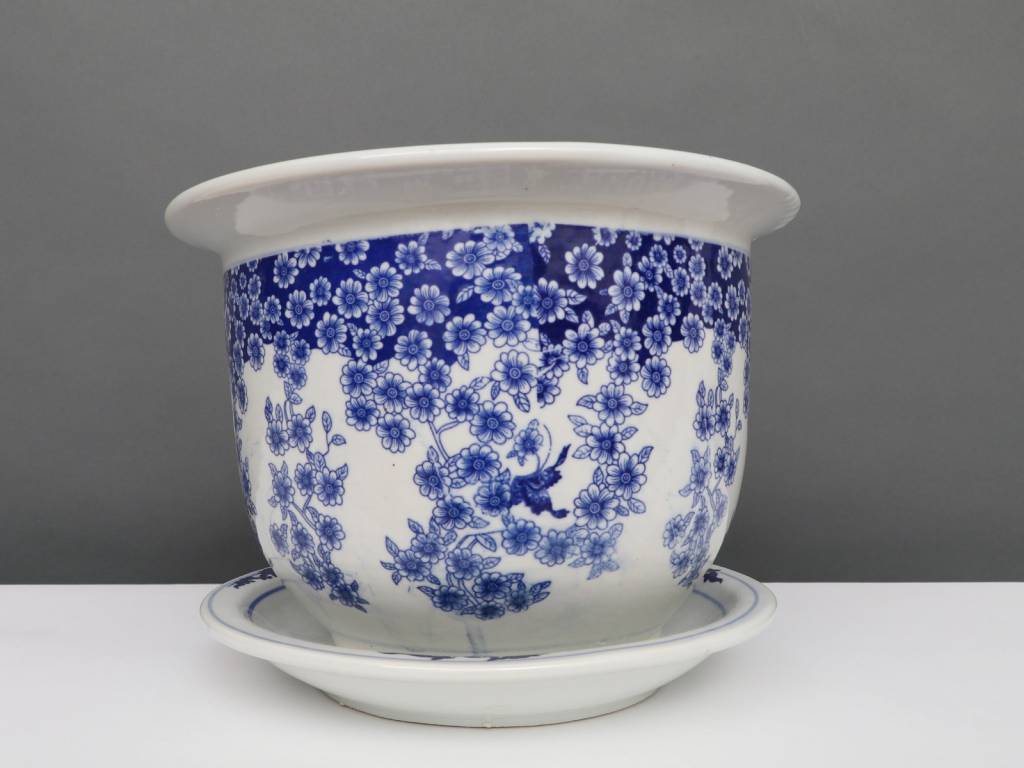 Dieser Porzellan Blumentopf mit einem Durchmesser von 19 Zentimetern besitzt ein klassisches chinesisches blau-weiß Dekor mit einem Schmetterling Pflanzenmotiv.