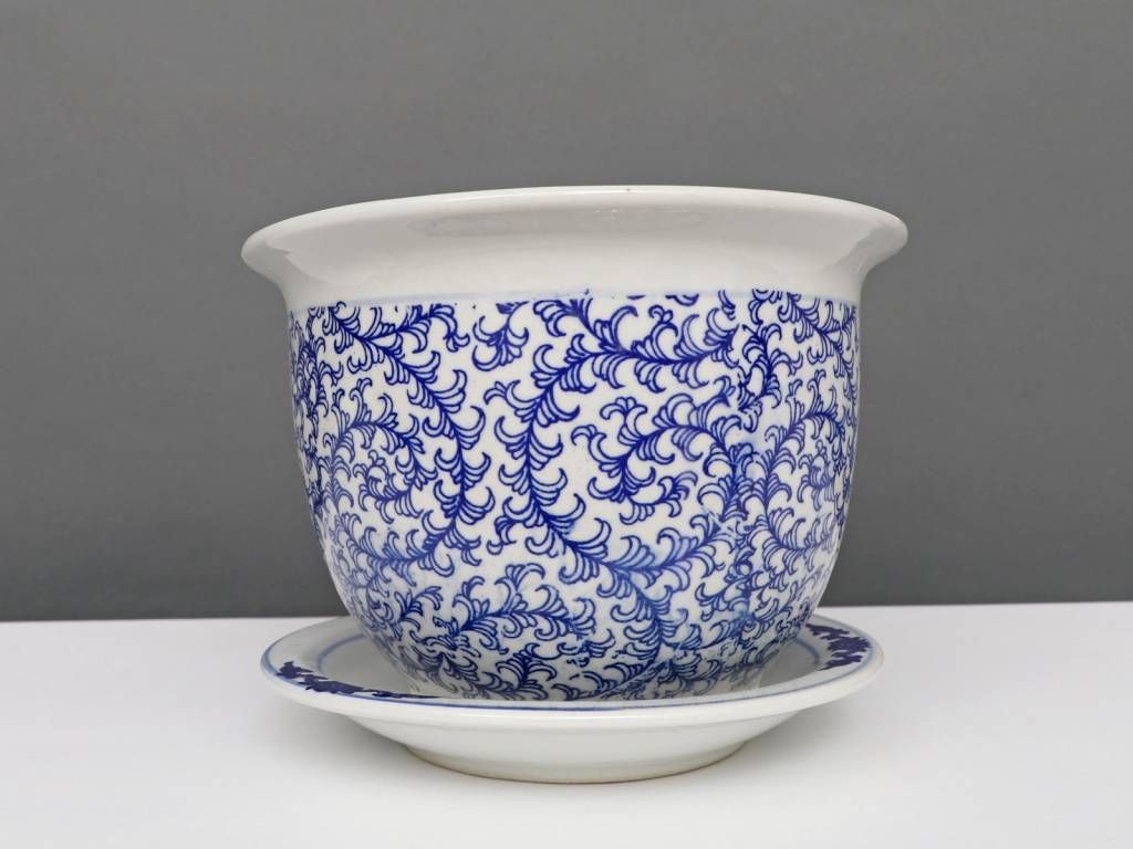 Der Blumentopf wird mit einem dekorativen Porzellan Untersetzter geliefert und ist Teil einer Serie von Porzellan Blumentöpfen / Übertöpfen mit identischem Design mit Blau-Weiß schnecken Blätter.