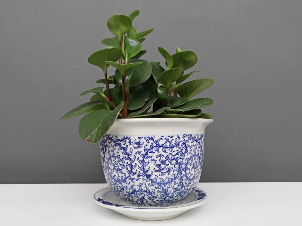 Der Blumentopf wird mit einem dekorativen Porzellan Untersetzter geliefert und ist Teil einer Serie von Porzellan Blumentöpfen / Übertöpfen mit identischem Design mit Blau-Weiß schnecken Blätter.