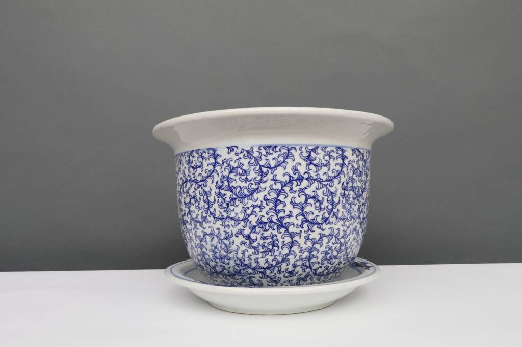 Der Blumentopf wird mit einem dekorativen Porzellan Untersetzter geliefert und ist Teil einer Serie von Porzellan Blumentöpfen / Übertöpfen mit identischem Design mit Blau-Weiß schnecken Blätter.