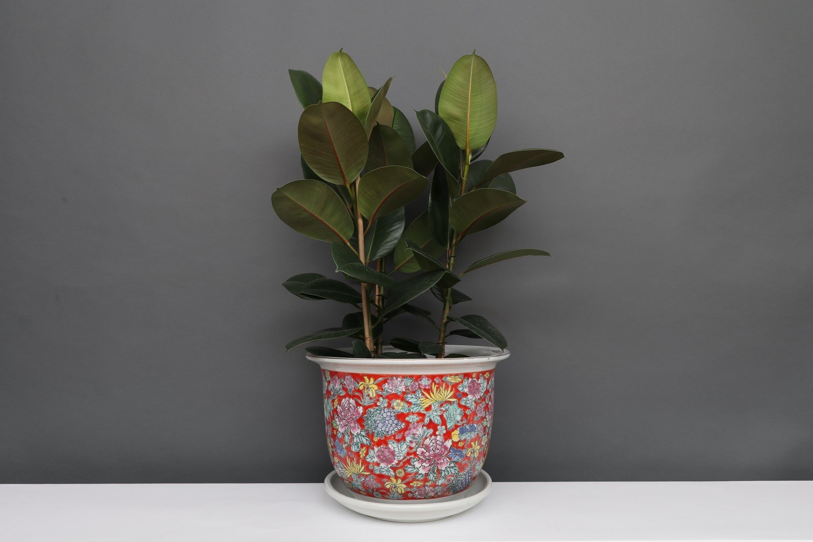 Dieser Porzellan Blumentopf mit einem Durchmesser von 26 Zentimetern besitzt besondere schöne Rot mit bunten Blumenmotiv.