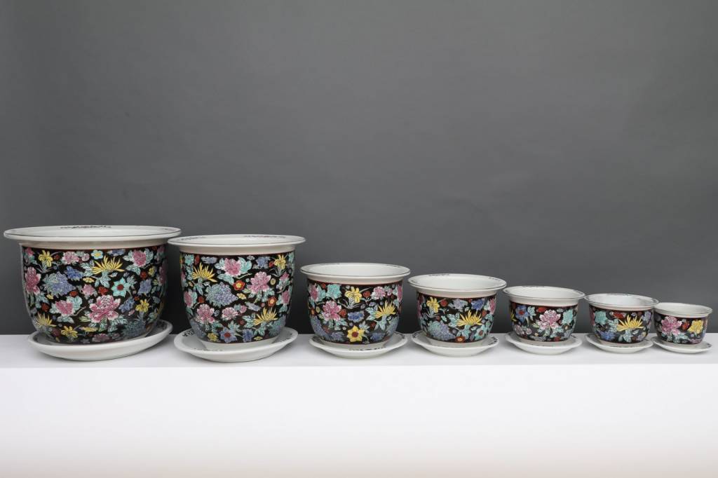 Dieser Porzellan Blumentopf mit einem Durchmesser von 13 Zentimetern besitzt besondere schöne Schwarz mit bunten Blumenmotiv.