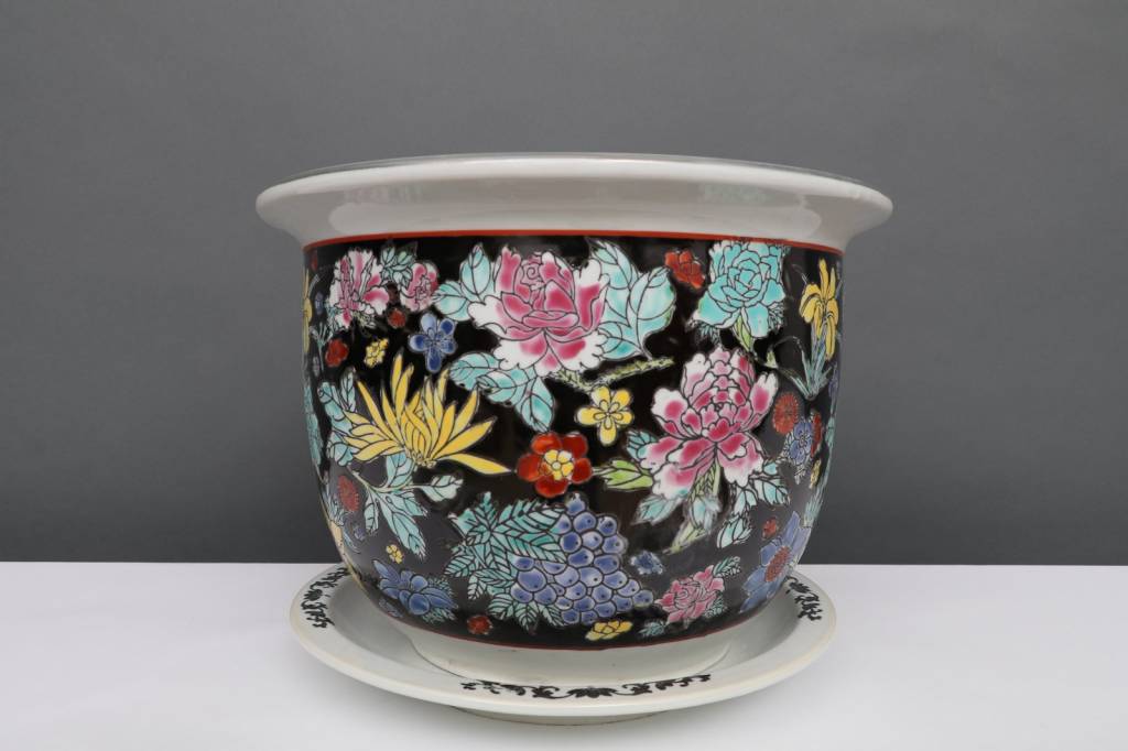 Dieser Porzellan Blumentopf mit einem Durchmesser von 19 Zentimetern besitzt besondere schöne Schwarz mit bunten Blumenmotiv.