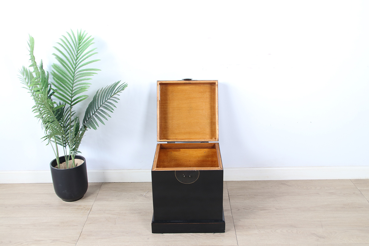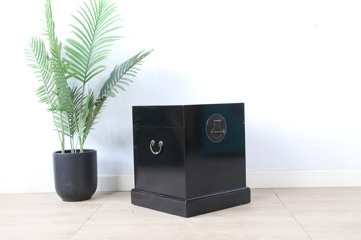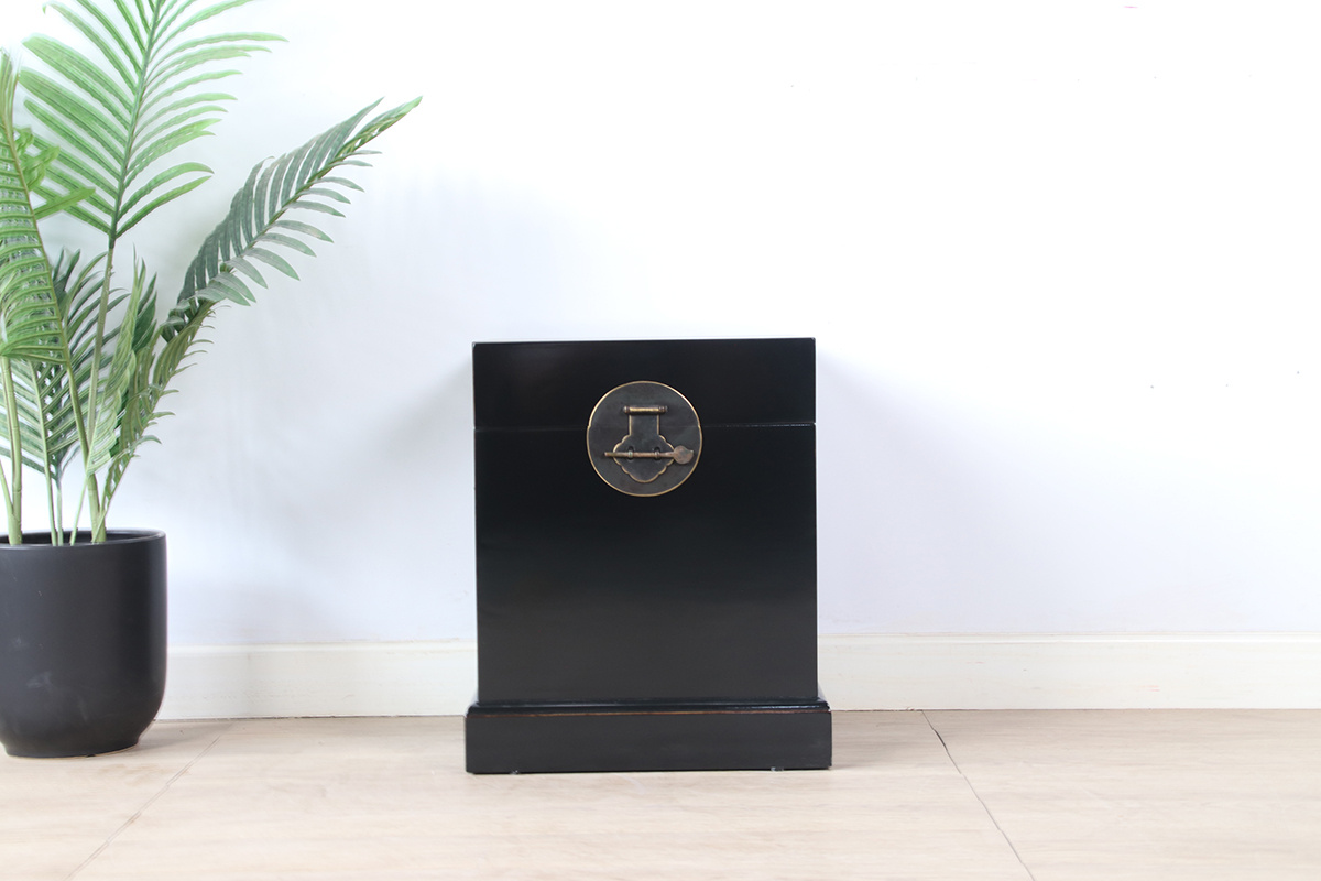 Chinesische Truhe aus Massivholz in elegantem Schwarz mit traditionellem Messingbeschlag. Praktisches asiatisches Möbelstück zur Aufbewahrung von Decken, Kleidung oder Accessoires und zugleich ein dekorativer Blickfang im Wohnraum.