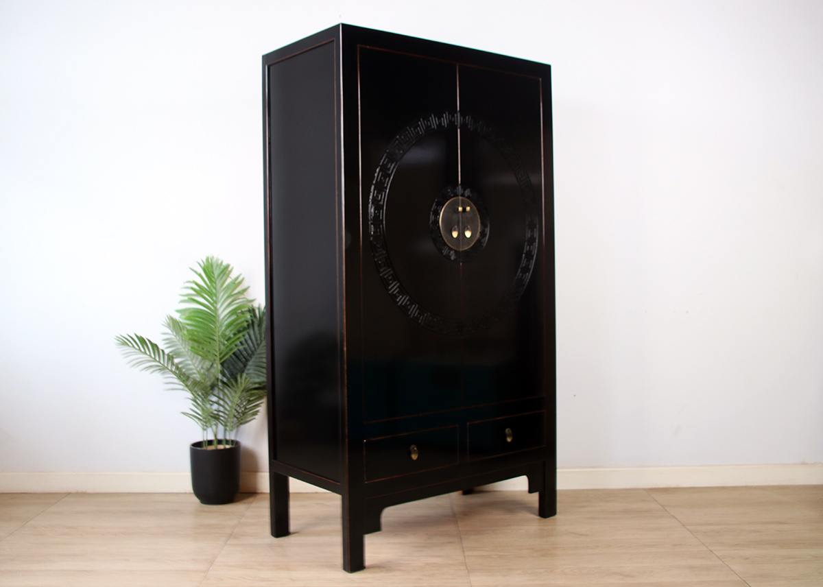 Bring a touch of Far Eastern elegance to your home with this handcrafted wedding cabinet. The black finish with subtle antique wear lends the piece an authentic, timeless character. The center doors are intricately carved with the Chinese word for "health and harmony," lending the cabinet a deeper symbolic meaning while also enriching the ambiance of the room. This cabinet not only provides practical storage space but also an elegant and calming presence in your home.