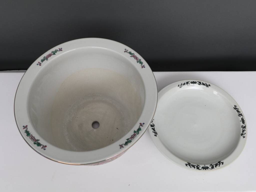 The flower pot is supplied with a decorative porcelain saucer and is part of a series of porcelain flower pots / planters with identical design with flower pattern.
