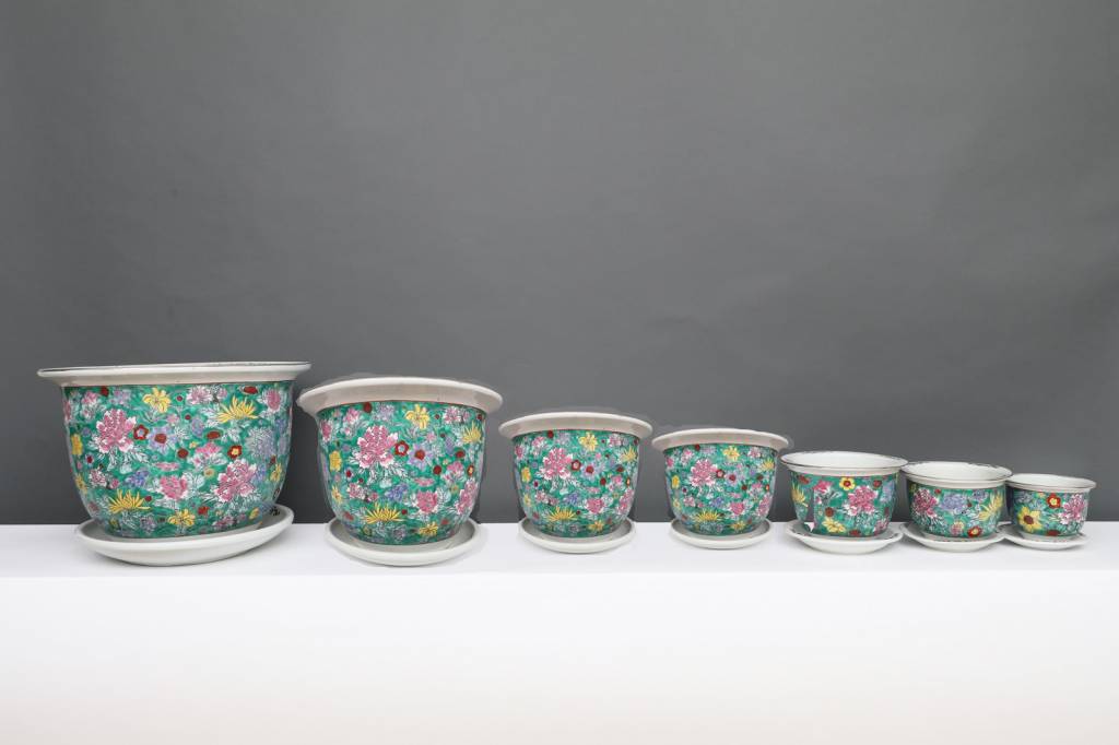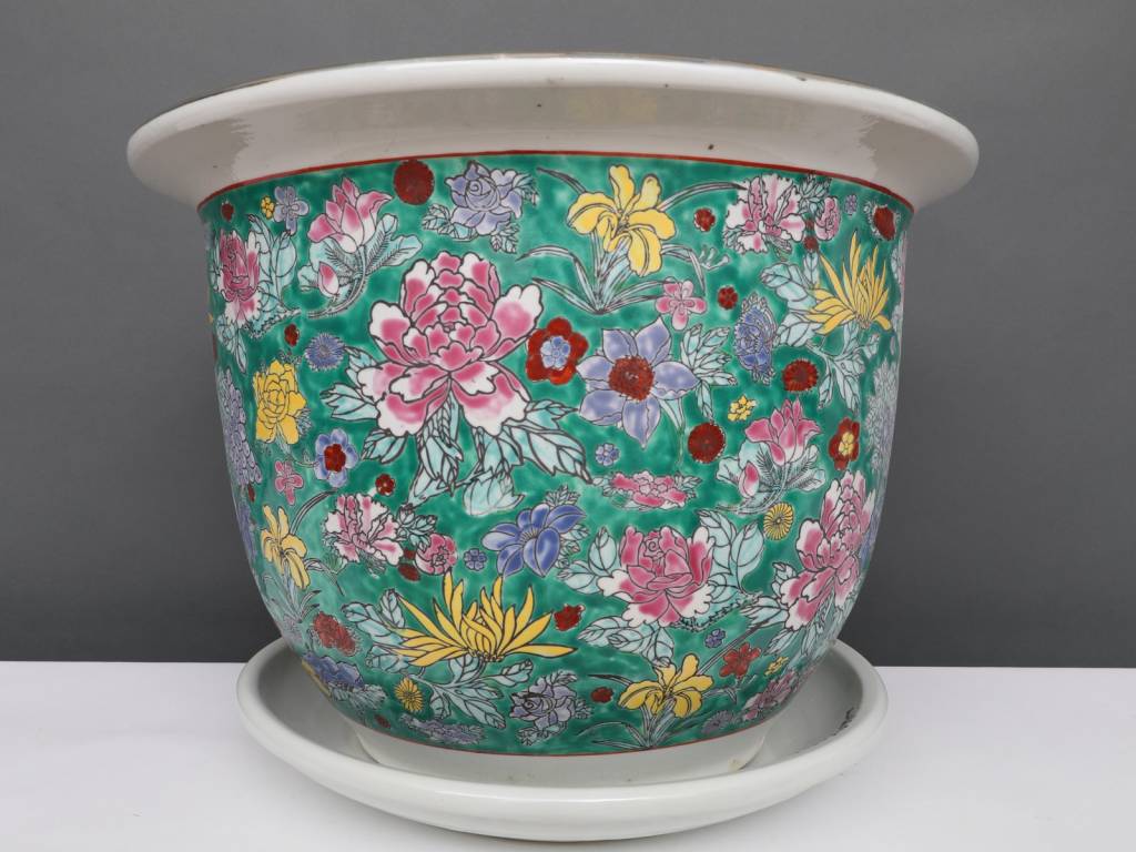 This porcelain flowerpot with a diameter of 30 centimeters has a special beautiful green with colorful floral motif.
