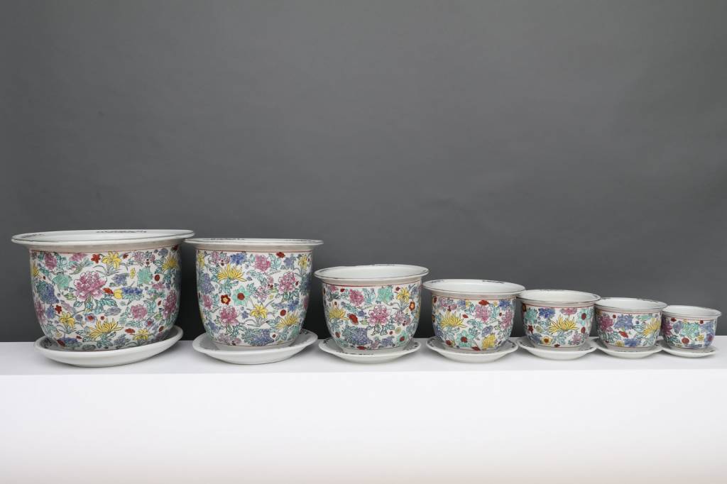The flower pot is supplied with a decorative porcelain saucer and is part of a series of porcelain flower pots / planters with identical design with flower pattern.
